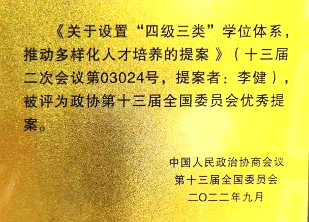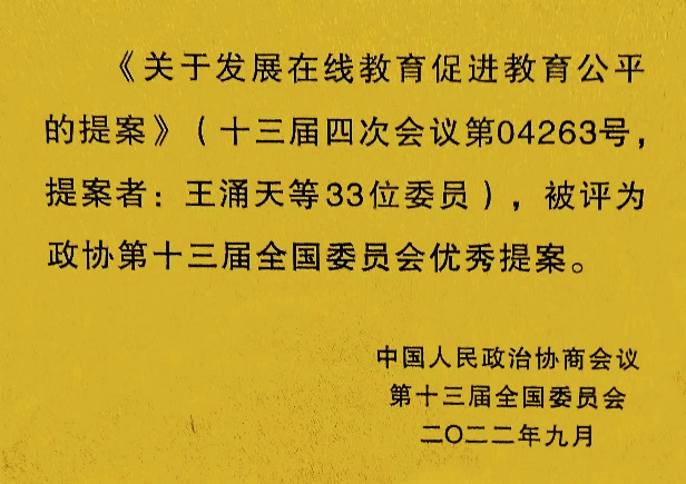 全国政协委员、北京市党外知识分子联谊会常务理事、北理工知联会会长、光电学院王涌天教授领衔提出的《关于发展在线教育促进教育公平的提案》,全国政协委员、北理工知联会副会长、人文与社会科学学院院长李健提出的《关于设置“四级三类”学位体系,推动多样化人才培养的提案》被评选为政协第十三届全国委员会优秀提案。