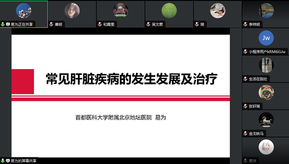 北京地坛医院是一家以传染病学为重点和特色的三级甲等医院,集医疗、科研、教学、预防于一体,为国家传染病医学中心主体医院。易为医生经验丰富,在肝病的研究方面有深厚的造诣。她详细讲述了肝脏的功能,系统阐述了酒精性肝病、非酒精性脂肪性肝病、药物性肝病、慢性乙型丙型肝炎等几种常见肝病的发生发展过程、治疗手段及预防方法,并结合临床医学的实例和相关统计数据,为大家带来一场内容深刻、形象生动的医学教育讲座,并与参加活动的人员进行了良好的沟通和互动。